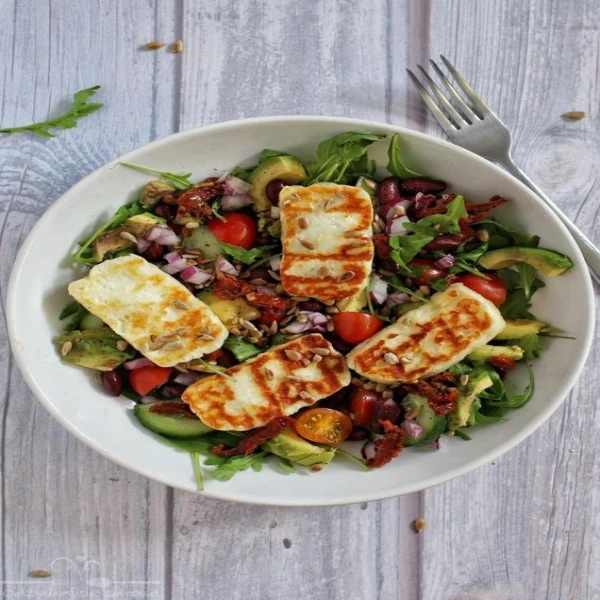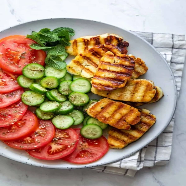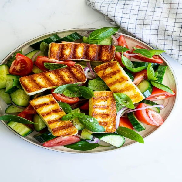 نشوي جبنة الحلوم على الجانبين في مقلاة ونقدمها على السلطة.