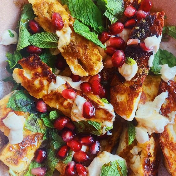 نضع جبنة الحلوم والكرز المشوية على جبنة اللبنة.